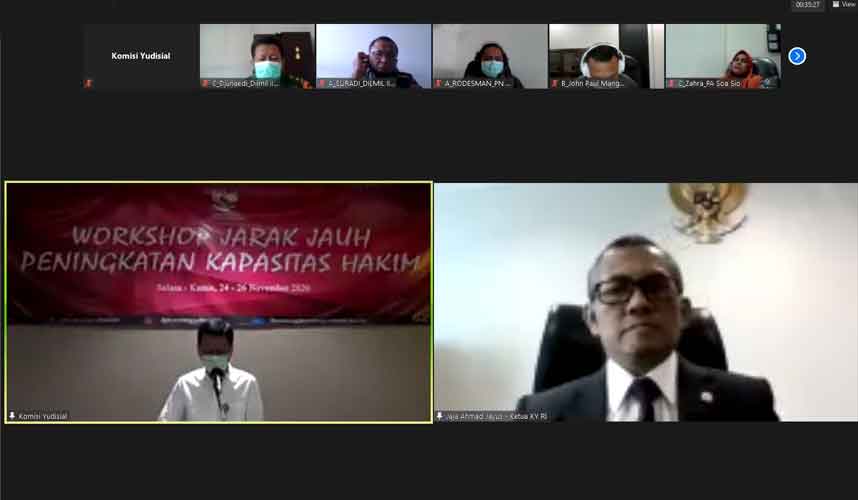 Ketua Komisi Yudisial (KY) Jaja Ahmad Jayus memberikan sambutan sekaligus membuka secara resmi Workshop Jarak Jauh Peningkatan Kapasitas Hakim di tahun 2020. Pembukaan workshop dilaksanakan pada Selasa (24/11) melalui zoom meeting.