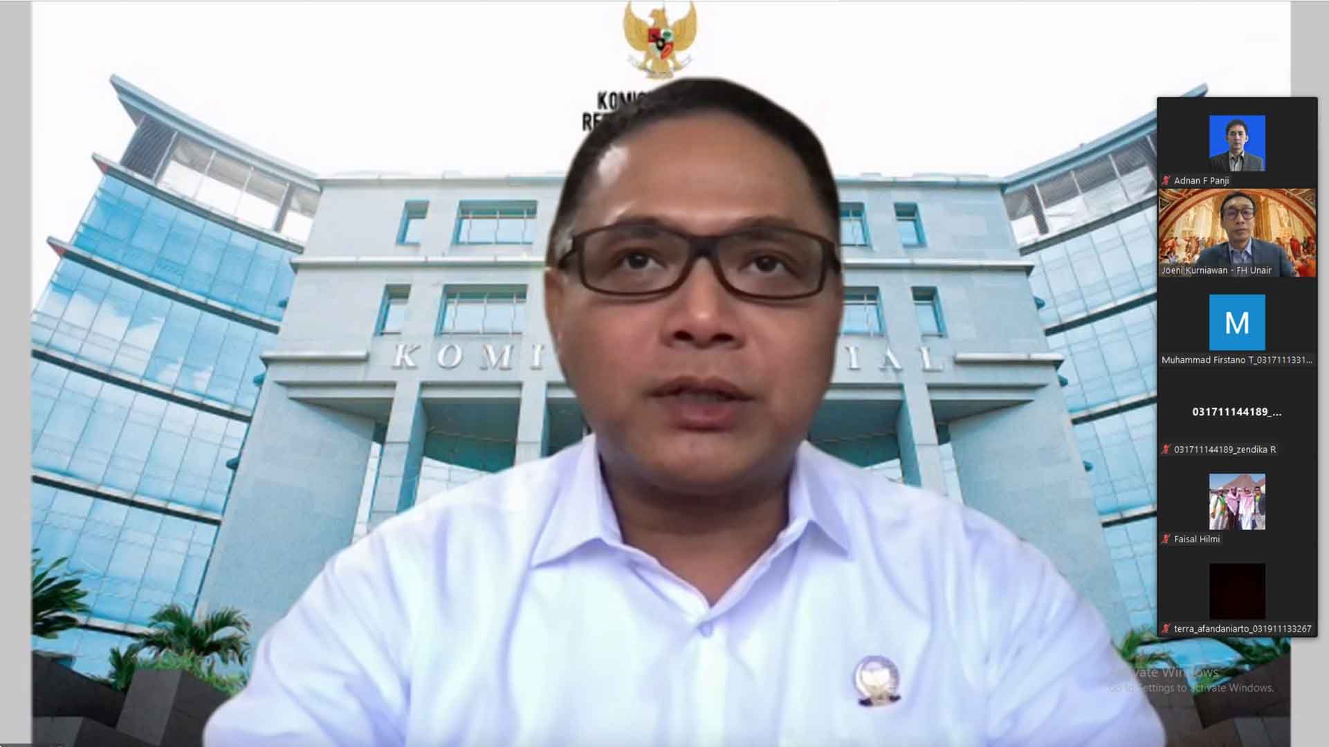 Anggota Komisi Yudisial (KY) Binziad Kadafi saat memberikan materi dalam kuliah umum yang bertajuk "Komisi Yudisial dan Perannya dalam Menjaga Etika Profesi Hakim" yang diselenggarakan oleh Universitas Airlangga Surabaya, pada Selasa (24/11) secara virtual.