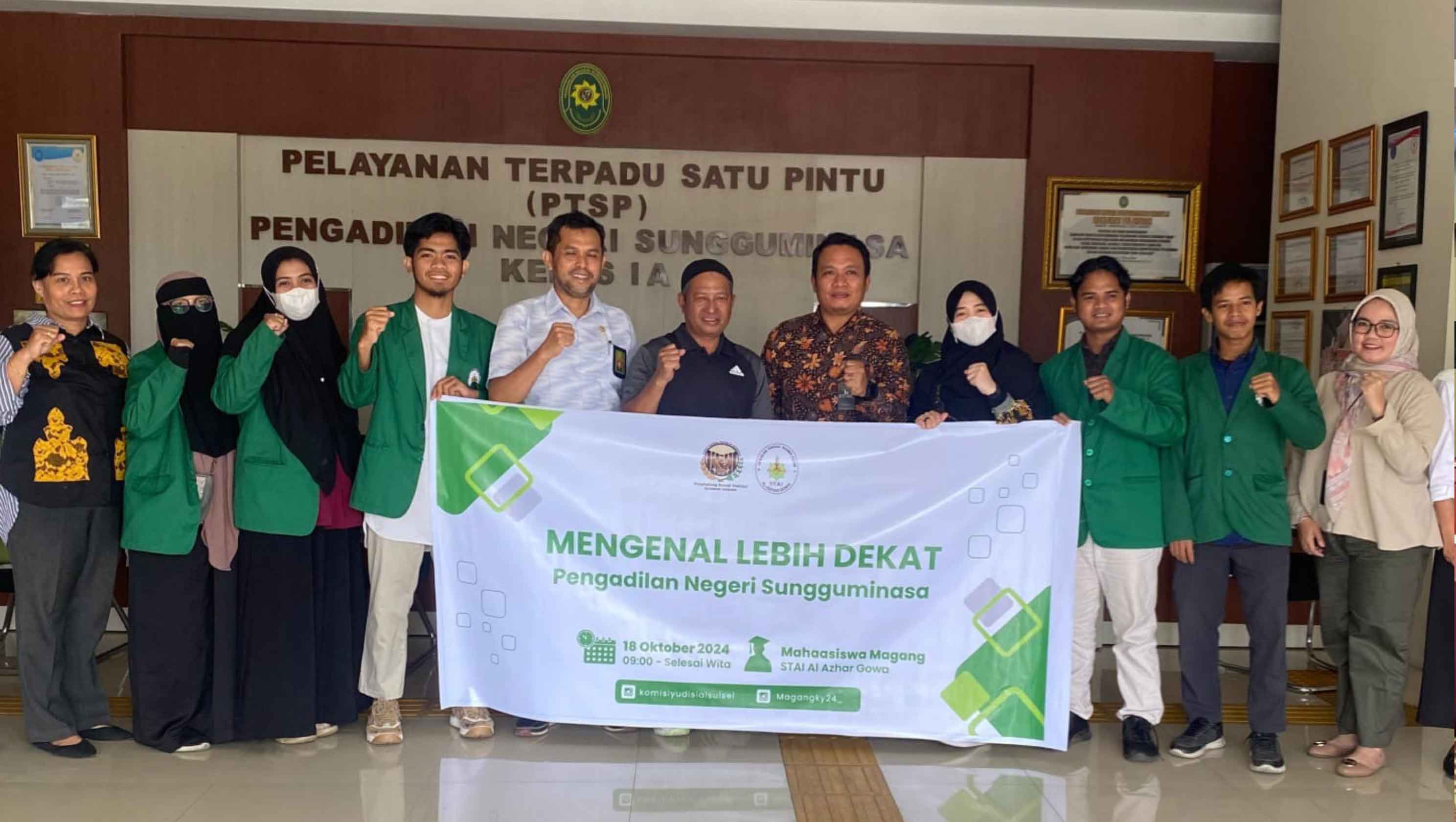 Penghubung Komisi Yudisial (KY) Sulawesi Selatan (Sulsel) mengajak mahasiswa magang Prodi Keluarga Hukum Islam STAI Al Azhar Gowa untuk berkunjung ke Pengadilan Negeri (PN) Sungguminasa, Jumat (18/10/24) melalui kegiatan “Mengenal Pengadilan Lebih Dekatâ€.