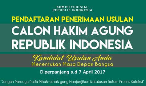 Komisi Yudisial (KY) memperpanjang masa penerimaan usulan seleksi calon hakim agung (CHA) Tahun 2017 hingga 7 April 2017 mendatang.