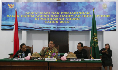 Sosialisasi dan Penjaringan Calon Hakim Agung dan Hakim Ad Hoc Tindak Pidana Korupsi di Mahkamah Agung di Auditorium Pengadilan Tinggi Tata Usaha Negara (PT TUN) Makassar pada Selasa (16/02).