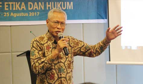 Ketua Bidang SDM, Advokasi, Hukum, Penelitian dan Pengembangan KY Sumartoyo saat memberikan pengantar dalam workshop Perbuatan Merendahkan Kehormatan dan Keluhuran Martabat Hakim dalam Perspektif Etika dan Hukum, Kamis (24/8) di Hotel Lombok Astoria, NTB.