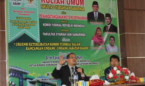 Ketua Bidang Hubungan Antar Lembaga dan Layanan Informasi KY Farid Wajdi di hadapan ratusan mahasiswa Fakultas Syariah (FASYA) Institut Agama Islam Negeri (IAIN) Samarinda, Kamis (7/9) di Auditorium Gedung Rektorat IAIN Samarinda, Kalimantan Timur.