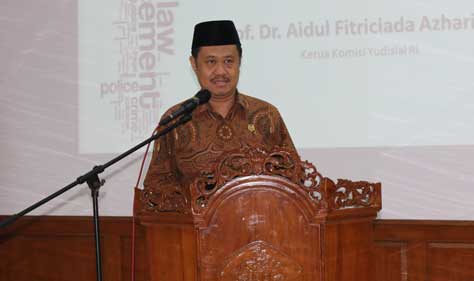 Ketua Komisi Yudisial (KY) Aidul Fitriciada Azhari saat jadi pemateri pada Seminar Hukum Nasional di Universitas Pancasila, Senin (6/11).