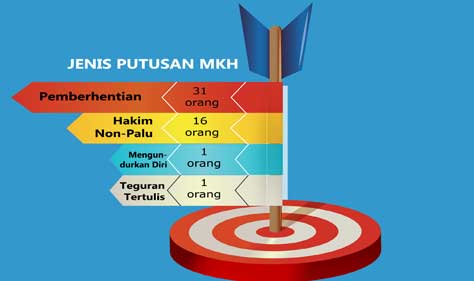 Jakarta (Komisi Yudisial) – Majelis Kehormatan Hakim (MKH) yang digelar sejak tahun 2009-2017 telah menjatuhkan hukuman berupa pemberhentian tetap terhadap 31 orang hakim. Selain itu, sebanyak 16 orang hakim dijatuhi sanksi berupa nonpalu 3 bulan sampai dengan 2 tahun, 1 orang dijatuhi sanksi ringan berupa teguran tertulis, dan 1 orang mengundurkan diri sebelum MKH.