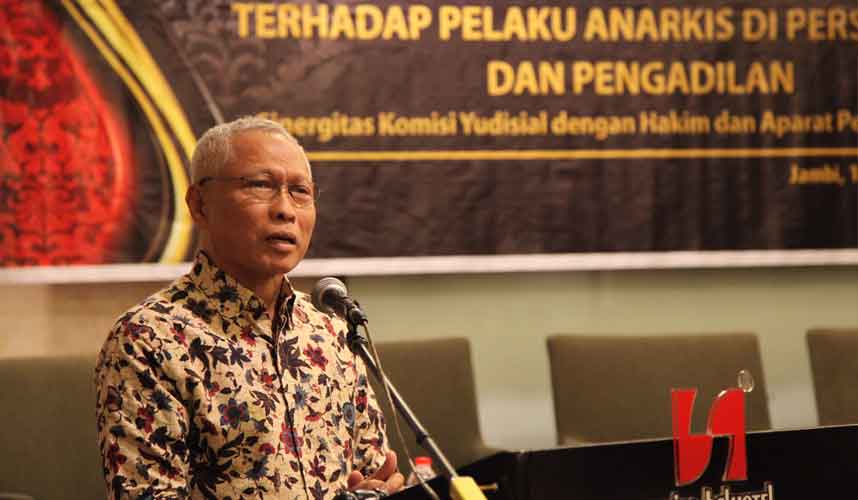 Hal tersebut disampaikan Ketua Bidang Sumberdaya Manusia, Advokasi, Hukum, Penelitian dan Pengembangan Komisi Yudisial (KY) Sumartoyo saat memberikan keynote speech sekaligus membuka Diskusi Publik Sinergitas Komisi Yudisial dengan Hakim dan Aparatur Penegak Hukum, bertajuk Upaya Pencegahan Hukum Terhadap Pelaku Anarkis di Persidangan dan Pengadilan, Kamis (14/3 di Hotel Swissbell, Jambi.