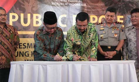 Palembang (Komisi Yudisial) - Ketua Komisi Yudisial (KY) Aidul Fitriciada Azhari meresmikan Kantor Penghubung KY Wilayah Sumatera Selatan (Sumsel). Peresmian ditandai dengan pembubuhan tanda tangan oleh Ketua KY dan Wakil Gubernur Sumsel Ishak Mekki di Kantor Penghubung KY Sumsel, Selasa (18/04), Palembang.   Kantor baru yang ditempati oleh Penghubung KY...