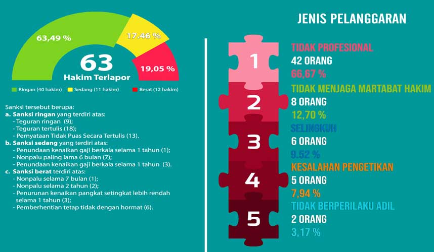 Jakarta (Komisi Yudisial) – Komisi Yudisial (KY) merekomendasikan 63 hakim terlapor dijatuhi sanksi. Berdasarkan Sidang Pleno, ada 38 putusan yang dinyatakan terbukti melanggar KEPPH dan 251 putusan yang dinyatakan tidak terbukti melanggar KEPPH.   “KY merekomendasikan 40 hakim terlapor direkomendasikan dijatuhi sanksi ringan, 11 hakim terlapor direkomendasikan dijatuhi sanksi sedang,...