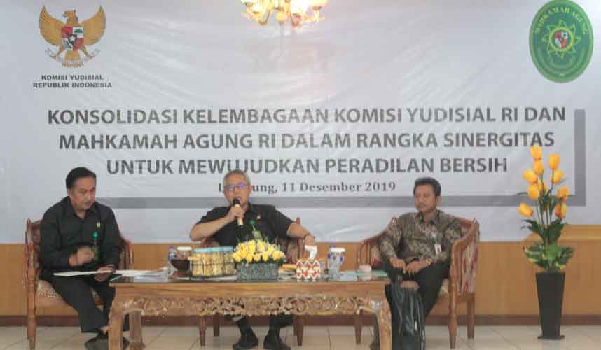 Lampung (Komisi Yudisial) - Komisi Yudisial (KY) selenggarakan “Konsolidasi Kelembagaan Komisi Yudisial RI dan Mahkamah Agung RI dalam rangka Sinergisitas untuk Mewujudkan Peradilan Bersih” di Aula Pengadilan Tinggi Tanjung Karang, Lampung, Rabu (11/12).   Hadir pada kesempatan tersebut Kepala Badan Pengawasan (Bawas) Mahkamah Agung (MA) Nugroho Setiadji, Kepala Biro Pengawasan...