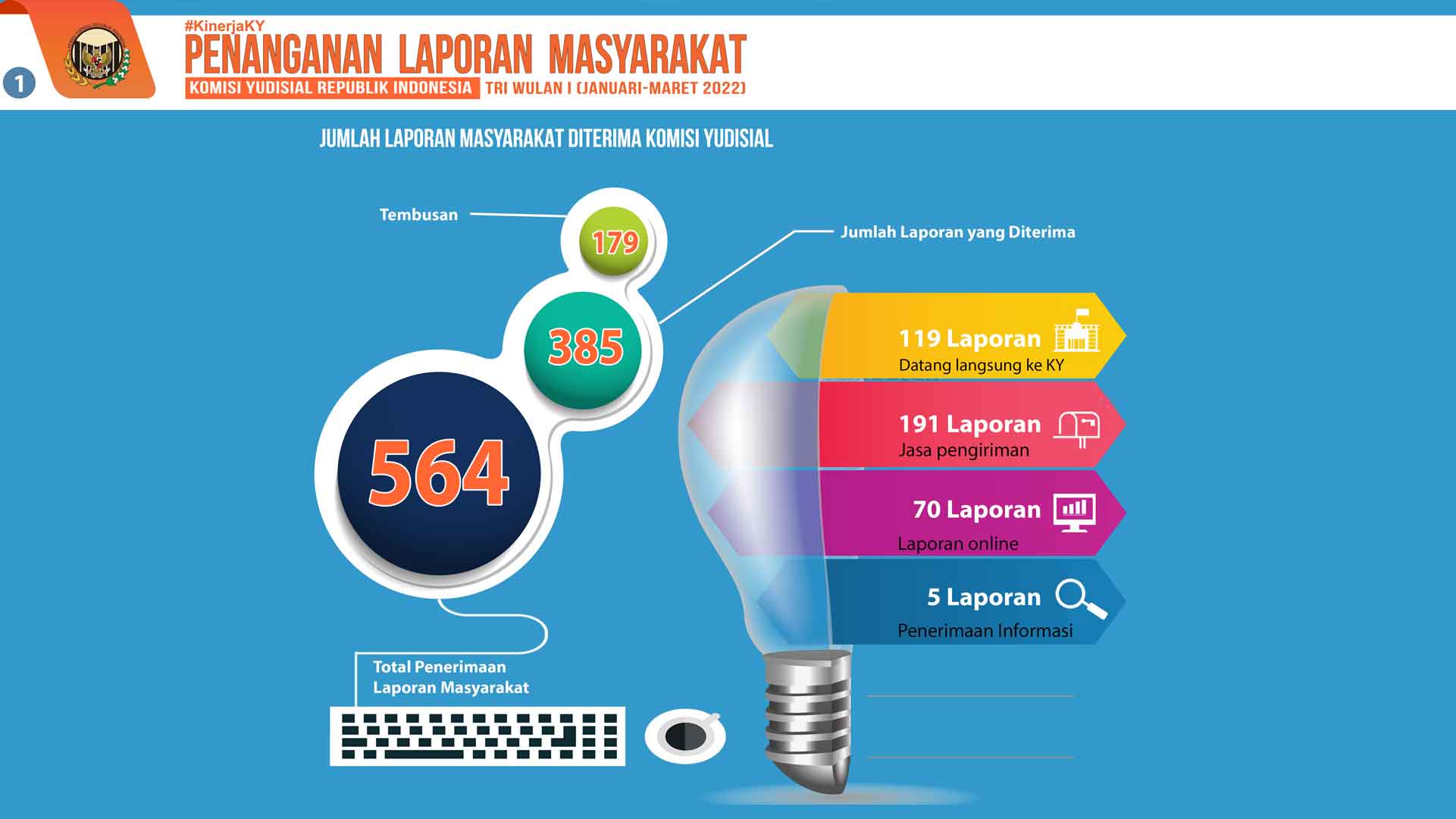 Jakarta (Komisi Yudisial) - Komisi Yudisial (KY) telah menerima 385 laporan masyarakat dan 179 surat tembusan dugaan pelanggaran Kode Etik dan Pedoman Perilaku Hakim (KEPPH) pada triwulan pertama tahun 2022. Dibandingkan triwulan pertama tahun 2021, jumlah laporan masyarakat relatif sama di mana tahun lalu berjumlah 378 laporan. "Sejak pandemi Covid-19 tren laporan...