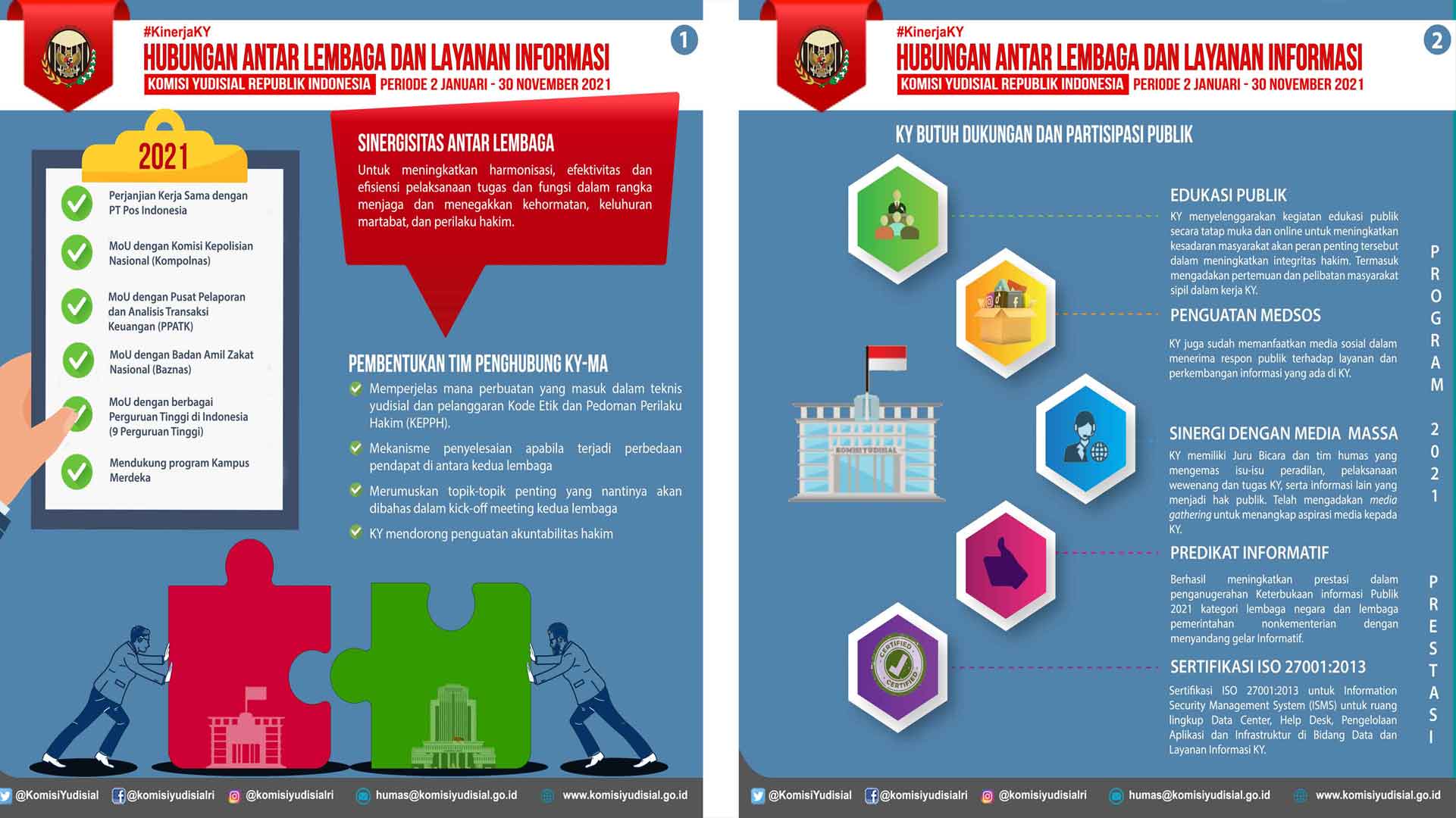 Jakarta (Komisi Yudisial) - Sepanjang Januari hingga Desember 2021, Komisi Yudisial (KY) menangani 13 laporan/informasi yang dianggap merendahkan kehormatan dan keluhuran martabat hakim. Salah satu tugas KY adalah mengambil langkah hukum atau langkah lain terhadap pihak yang merendahkan kehormatan dan keluhuran martabat hakim atau PMKH. Tindakan tersebut berupa advokasi pada hakim....