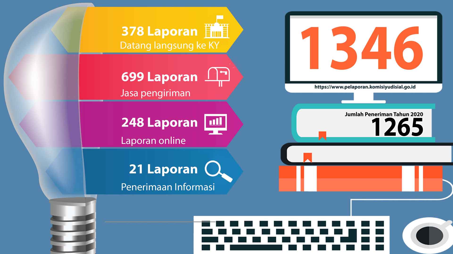 Jakarta (Komisi Yudisial) - Komisi Yudisial (KY) telah menerima 1346 laporan masyarakat dan 783 surat tembusan dugaan pelanggaran Kode Etik dan Pedoman Perilaku Hakim (KEPPH) pada periode 2 Januari - 30 November 2021.  Jumlah laporan tersebut naik sekitar 6,4 persen bila dibandingkan pada November tahun lalu yang mencapai 1265 laporan...