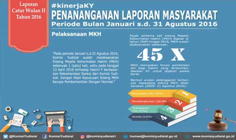 Jakarta (Komisi Yudisial) - Sejak pertama kali sidang Majelis Kehormatan Hakim (MKH) digelar di tahun 2009 hingga Agustus 2016, KY telah melaksanakan 45 kali sidang MKH. Kasus penyuapan masih mendominasi penyebab seorang hakim diajukan ke MKH. Kemudian diikuti kasus perselingkuhan dan indisipliner.   “Dari keseluruhan MKH yang digelar, kasus penyuapan dan...