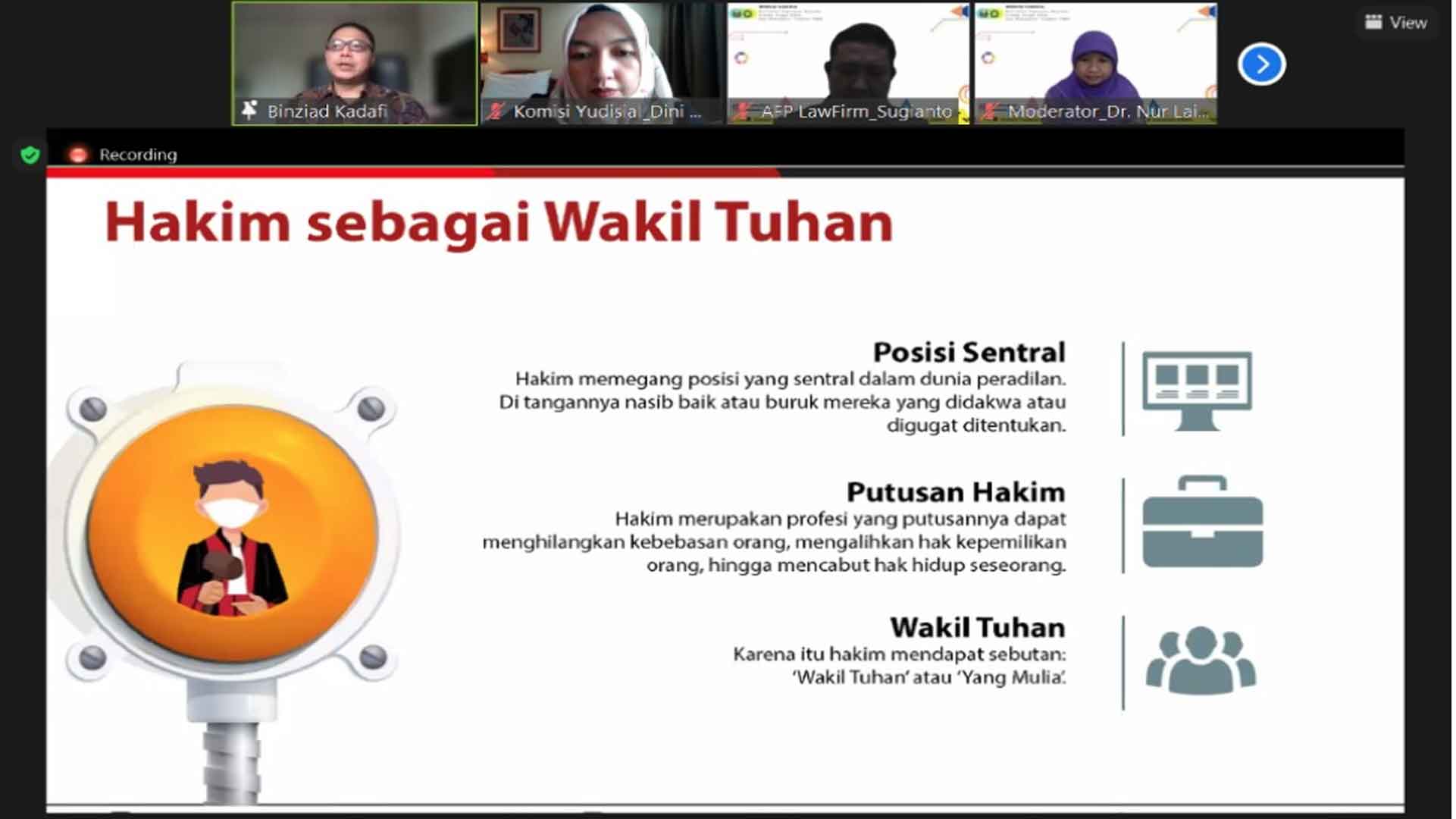 Surabaya (Komisi Yudisial) - Anggota Komisi Yudisial (KY) Binziad Kadafi menjadi narasumber webinar nasional “Merevitalisasi Kepercayaan Masyarakat terhadap Penegakan Hukum Guna Meminimalisir Terjadinya Perbuatan Merendahkan Kehormatan Hakim (PMKH)”, yang dilaksanakan secara virtual pada Sabtu (13/11). Kegiatan ini merupakan kerjasama antara KY dengan Fakultas Syariah dan Hukum Universitas Islam Negeri Sunan...