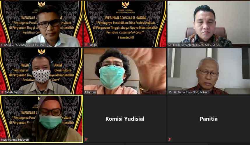 Jakarta (Komisi Yudisial) – “Ada dua upaya untuk mencegah terjadinya contempt of court (CoC). Pertama dengan melibatkan perguruan tinggi untuk mencegah. Kedua adalah penindakan terhadap pelaku.”   Pernyataan tersebut disampaikan Ketua Komisi Kejaksaan Barita Simanjuntak dalam  Webinar Advokasi Hakim yang mengambil tema “Pentingnya Pendidikan Etika Profesi Hukum di Perguruan Tinggi...