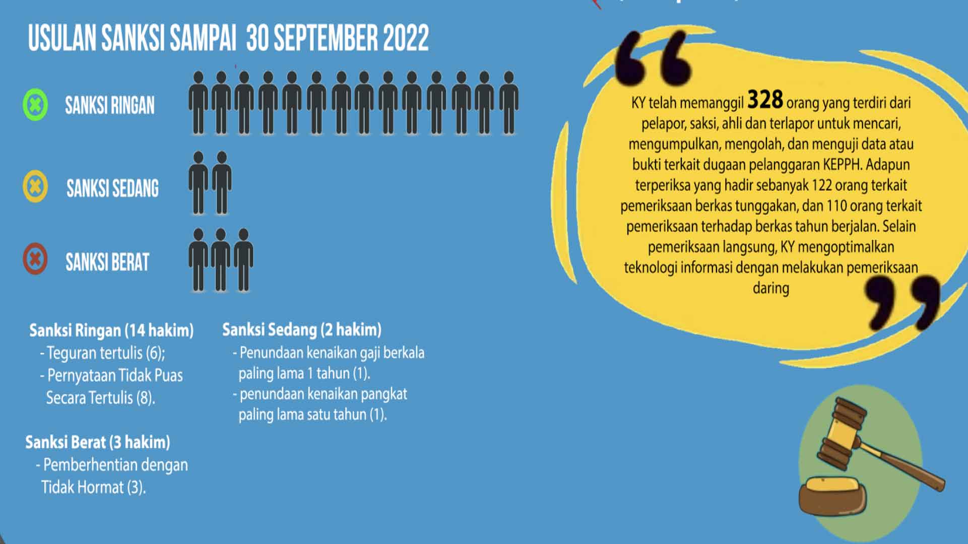 Jakarta (Komisi Yudisial) - Komisi Yudisial (KY) merekomendasikan 19 hakim dijatuhi sanksi karena  terbukti melanggar Kode Etik dan Pedoman Perilaku Hakim (KEPPH) pada triwulan ketiga tahun 2022. Adapun rincian hakim yang terbukti melanggar KEPPH, yaitu: 14 orang hakim dijatuhi sanksi ringan, 2 orang hakim dijatuhi sanksi sedang, dan 3 orang...