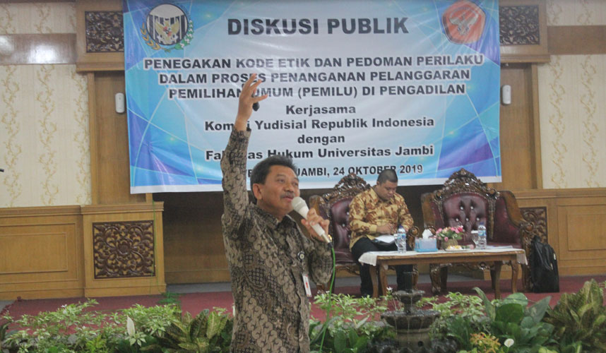 Jambi (Komisi Yudisial) - Komisi Yudisial (KY) bekerja sama dengan Fakultas Hukum Universitas Jambi selenggarakan Diskusi Publik “Penegakan Kode Etik dan Pedoman Perilaku dalam Proses Penanganan Pelanggaran Pemilihan Umum (Pemilu) di Pengadilan” di Aula Rektorat Universitas Jambi, Kamis (24/10).   Hadir sebagai pembicara Kepala Biro Pengawasan Perilaku Hakim KY KMS...