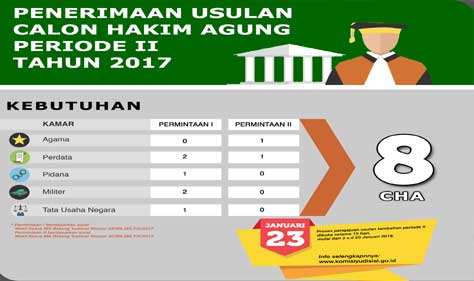 Jakarta (Komisi Yudisial) – Komisi Yudisial (KY) membuka tambahan usulan calon hakim agung (CHA) Periode II Tahun 2017 untuk mengisi 2 posisi hakim agung yang kosong. Penerimaan usulan ini merupakan tambahan seleksi sebelumnya untuk mengisi posisi 6 hakim agung.   “Seleksi tambahan ini untuk mengisi 2 hakim agung di kamar...